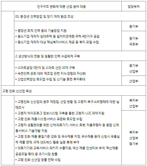¿À´Â 2022³â±îÁö ½º¸¶Æ®°øÀå 3¸¸°³¿Í ½º¸¶Æ® »ê¾÷´ÜÁö 10°³¸¦ ±¸ÃàÇϰí, ½º¸¶Æ® Á¦Á¶Àη 10¸¸¸íÀ» ¾ç¼ºÇϱâ·Î Çß´Ù. ¶Ç ¼÷·Ã ÀηÂÀÇ ÀºÅð¿¡ ´ëºñÇØ À̵éÀÇ Áö½Ä°ú °æÇèÀ» »ê¾÷ ÀÚ»êÈÇÏ´Â ¹æ¾Èµµ ÃßÁøÇÑ´Ù. ÀÌ¿Í ÇÔ²² ÀºÅð ÈÄ¿¡µµ »õ·Î¿î ÀÏ¿¡ µµÀüÇϰí Àû±ØÀûÀ¸·Î ¿îµ¿, ¿©Çà, ¼Òºñ, ¹®È Ȱµ¿À» ÇÏ´Â À̸¥¹Ù ¾×Ƽºê ½Ã´Ï¾î(Active Senior)¸¦ À§ÇÑ °í·É Ä£È »ê¾÷À» À°¼ºÇÑ´Ù´Â °èȹµµ ¹ßÇ¥µÆ´Ù. °í·ÉÀÚÀÇ ¿å±¸¡¤¼Òºñ ÇàÅ µî¿¡ ´ëÇÑ ½ÇÅÂÁ¶»ç¸¦ ÁøÇàÇϰí, À̸¦ ±â¹ÝÀ¸·Î ÇÏ´Â Á¤º¸½Ã½ºÅÛÀ» ±¸ÃàÇØ °í·É Ä£È Á¦Ç°¡¤¼ºñ½º¡¤½Ã½ºÅÛÀÇ Ç¥ÁØÈ ·Îµå¸ÊÀ» ¼ö¸³Çϱâ·Î Çß´Ù. ƯÈ÷ °í·É Ä£È Á¦Ç°ÀÇ Ç°Áú±âÁØÀ» °ÈÇÏ´Â µ¿½Ã¿¡ ¿ì¼ö Á¦Ç°¿¡ ´ëÇØ¼´Â ±ÔÁ¦ »÷µå¹Ú½º¸¦ Àû¿ëÇÑ´Ù´Â ¹æÄ§ÀÌ´Ù. ¶Ç °í·ÉÀÚ »ýȰÆíÀǸ¦ À§ÇÑ ½Å¾à, ÀÇ·á±â±â, ¼ºñ½º·Îº¿, ÀÚÀ²ÁÖÇàÀÚµ¿Â÷ µî À¶ÇÕ Á¦Ç°¡¤¼ºñ½ºÀÇ ±â¼ú°³¹ßÀ» Áö¿øÇÏ°í °ü·Ã ÀηÂÀ» ¾ç¼ºÇÏ´Â ¹æ¾Èµµ À̹ø ´ëÃ¥¿¡ Æ÷ÇԵƴÙ. Á¤ºÎ °ü°èÀÚ´Â "±âȹÀçÁ¤ºÎ, º¸°Çº¹ÁöºÎ, »ê¾÷Åë»óÀÚ¿øºÎ, Áß¼Òº¥Ã³±â¾÷ºÎ, °úÇбâ¼úÁ¤º¸Åë½ÅºÎ, ½ÄǰÀǾàǰ¾ÈÀüó µîÀÌ °øµ¿À¸·Î °í·É Ä£È ½Å»ê¾÷ âÃâ Àü·«À» ¼ö¸³¡¤ÃßÁøÇÒ °Í"À̶ó°í ¸»Çß´Ù.
